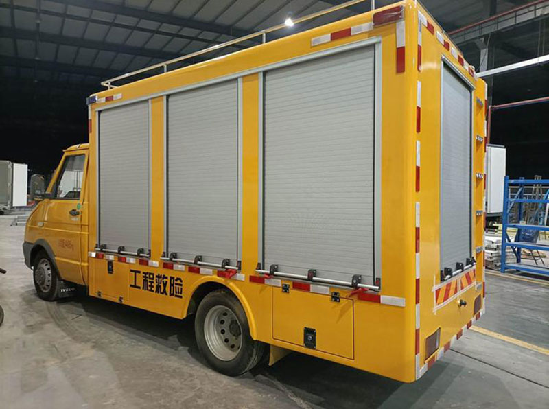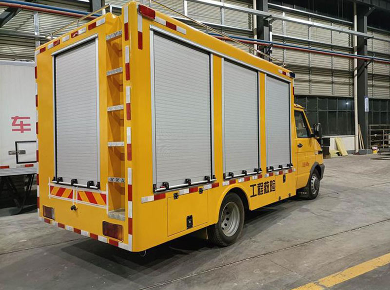 依維柯工程救險車主要配置:發電機組、進口大流量排水泵、靜音廂體、車載空調、液壓支腿、配電控制系統、電纜絞盤、防爆照明燈、車載開降照明及搶險工具等。