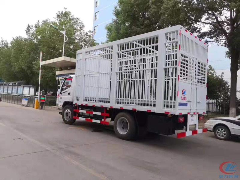 福田歐馬可5米倉欄式運豬車倉柵式運豬車,廂體尺寸:5020×2080×2180,材料可選碳鋼、不銹鋼,車廂分為兩層,第二層整體升降結構, 每層底板三隔欄(每隔欄配開門),尾部雙開門,加裝廢液收集箱,噴淋系統(tǒng)。